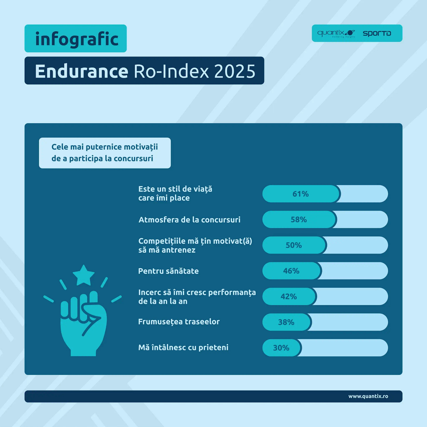 46% sunt motivați de impactul pozitiv asupra sănătății, 58% de atmosfera de la concursuri, 69% apreciază ca foarte importantă frumusețea traseelor