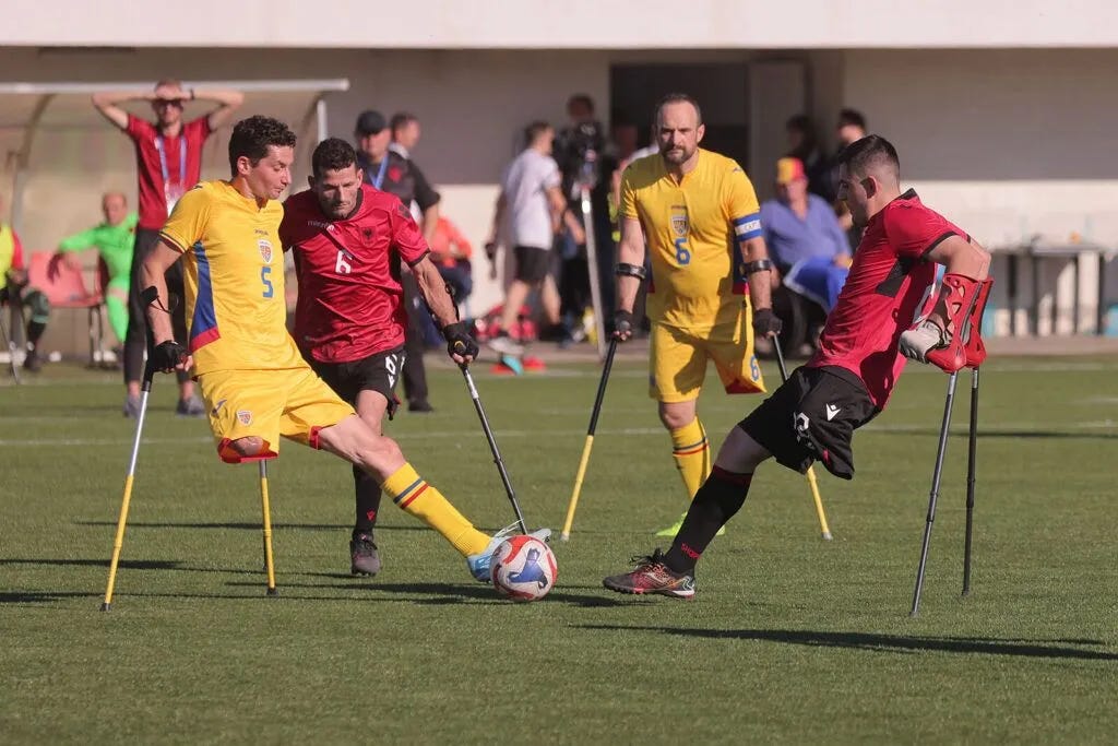 ⚽️ Formată în acest an, naționala de amputați a României joacă în acest weekend primele sale meciuri oficiale. Dacă vreți să-i susțineți și să vedeți cum se poate juca fotbal folosind cârjele, dar mai ales voința, România găzduiește la Centrul Național de Fotbal Buftea meciurile din Divizia D a Ligii Națiunilor, o competiție organizată de Federația Europeană de Fotbal pentru Amputați (EAFF) din doi în doi ani.